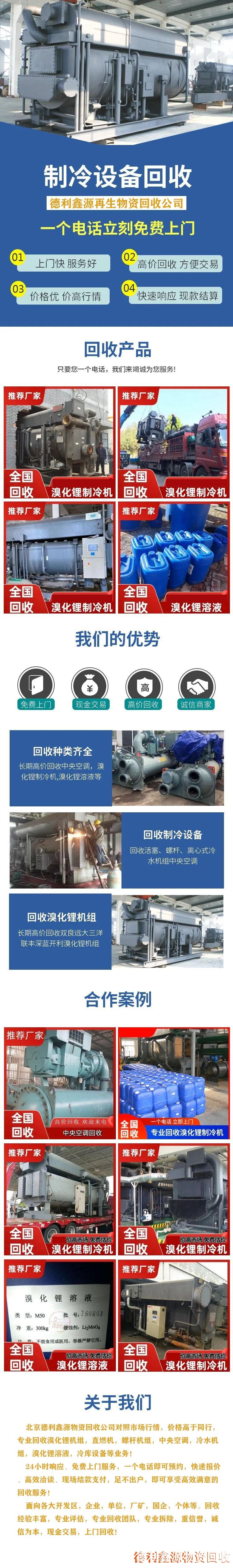 北京德利鑫源物資回收公司對照市場行情,價格高于同行,專業(yè)回收溴化鋰機組,直燃機,螺桿機組,中央空調,冷水機組,溴化鋰溶液,冷庫設備等業(yè)務!24小時響應、免費上門服務。